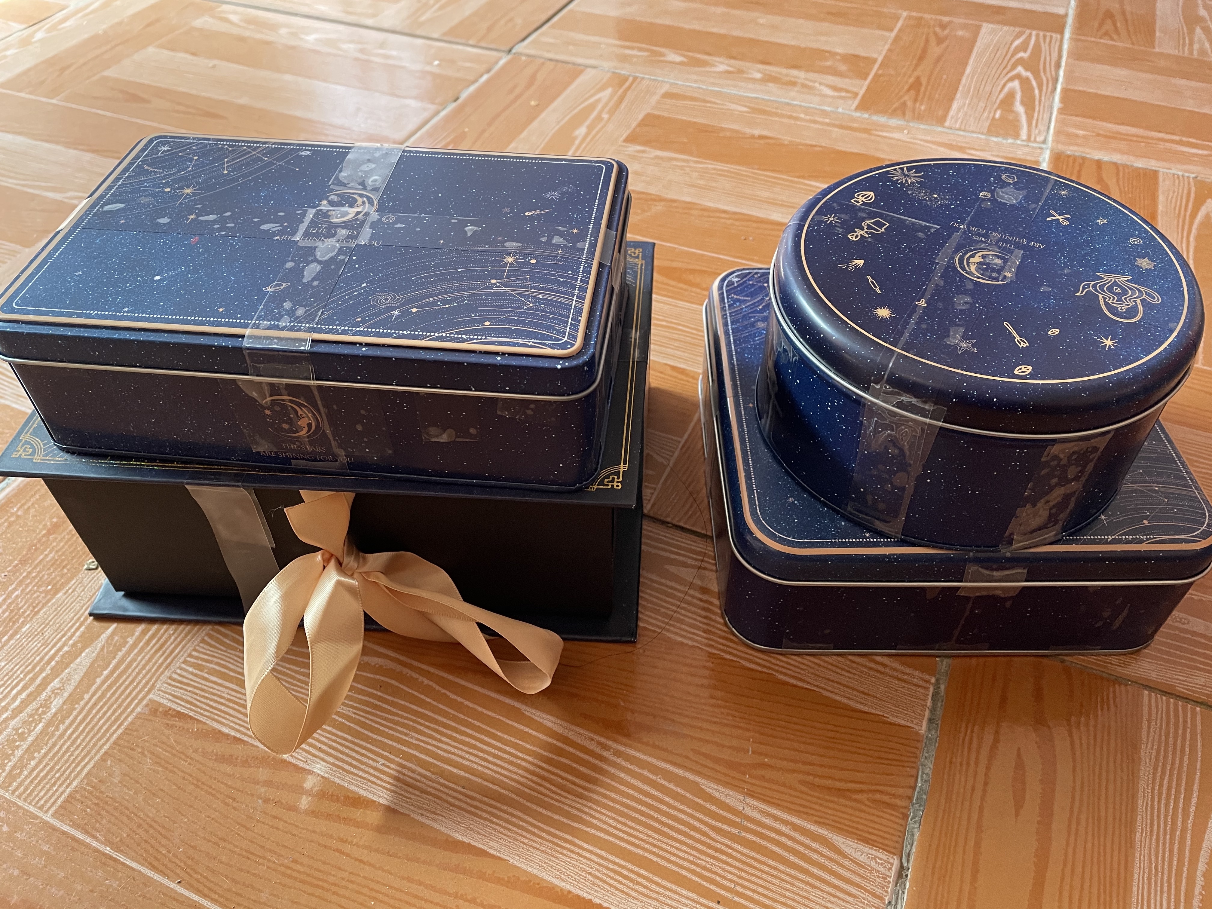 拿到手里的时候,满满当当一个超级大的包装盒,装着女朋友满满地爱心,开心~。拿到家里,拆开了外包装,映入眼帘的是四大盒精美的包装盒,上面用胶带严严实实地包装着,从外面,我嗅到了美食的味道~ 整体的包装是星空主题的: