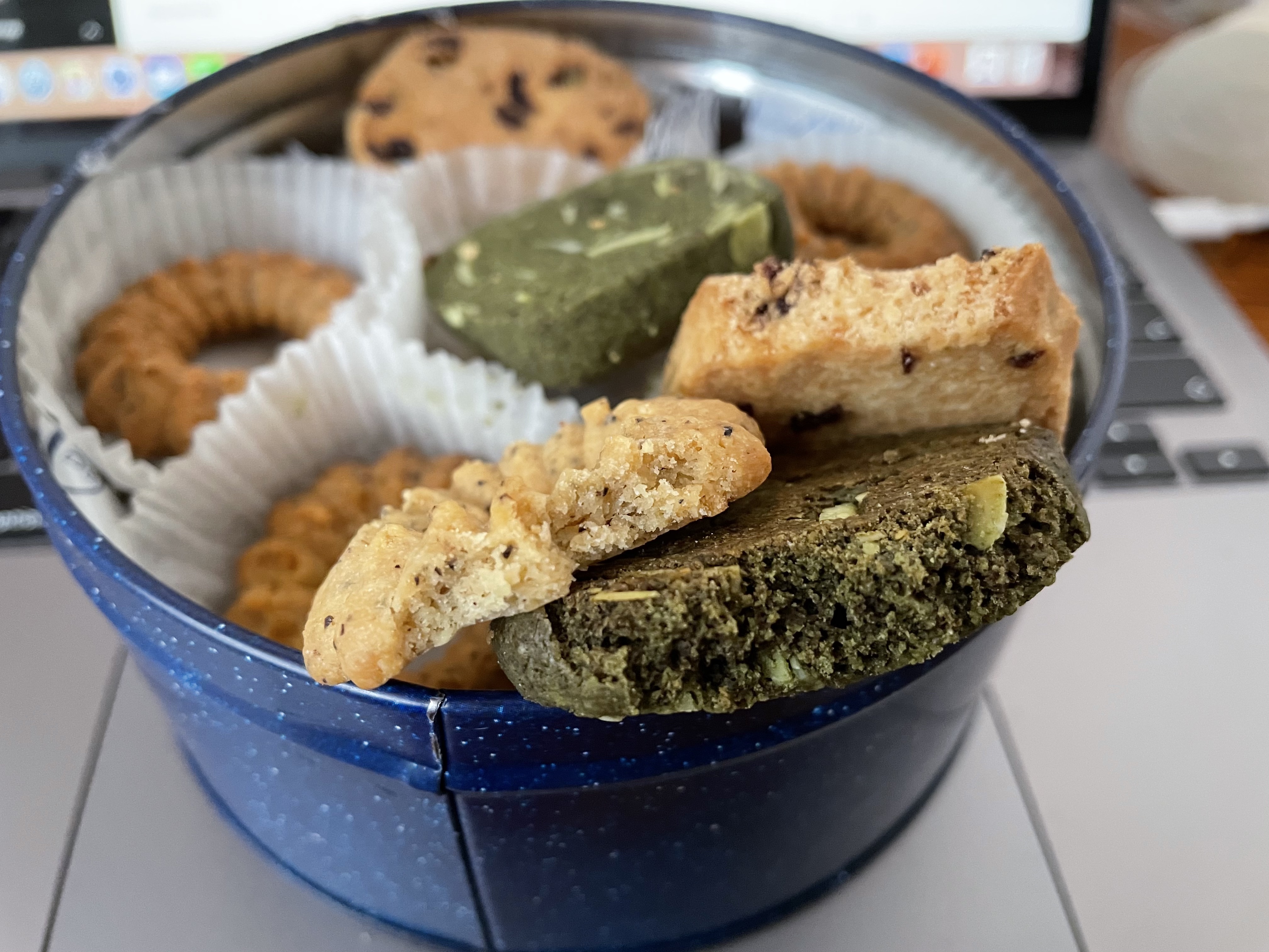 甜点3: 抹茶/红茶/蔓越莓曲奇。Applef亲手做了一个曲奇组合,哇,全是我喜欢吃的口味~ 抹茶口味的稍微苦一点点,但是吃完嘴里面也是满满的抹茶味道,很好次!红茶的稍微脆一点,淡淡的红茶味道,也不是那么甜,所以吃起来一点也不腻,回味无穷。蔓越莓曲奇整体偏硬一点,里面酸酸甜甜的蔓越莓很好次~一口抹茶,一口红茶,一口蔓越莓,超级幸福~下面附上实拍图:👇